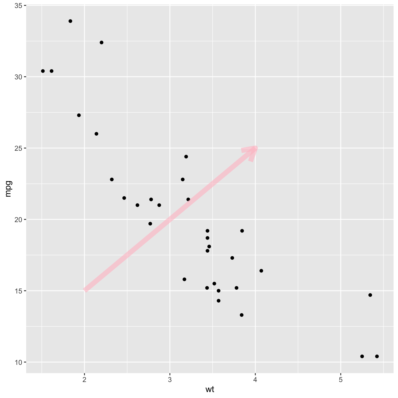 p + annotate("segment", x = 2, xend = 4, y = 15, yend = 25, colour = "pink", size=3, alpha=0.6, arrow=arrow())