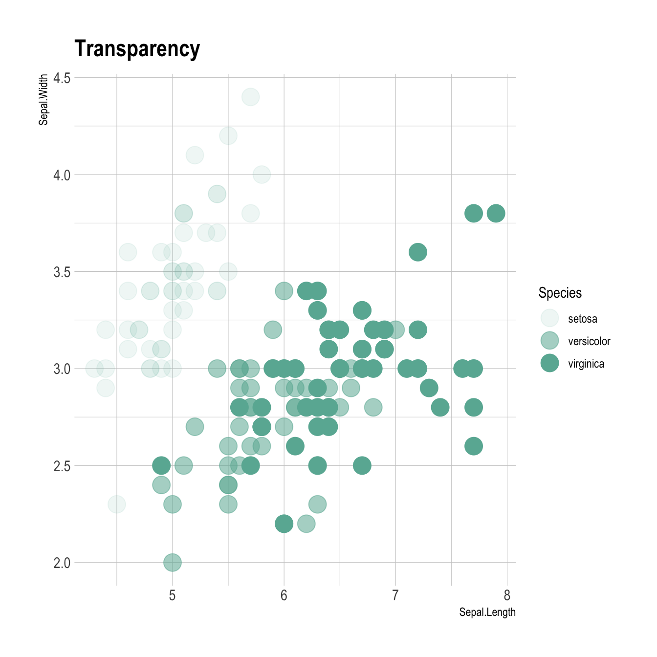 ggplot(iris, aes(x=Sepal.Length, y=Sepal.Width, alpha=Species)) +
