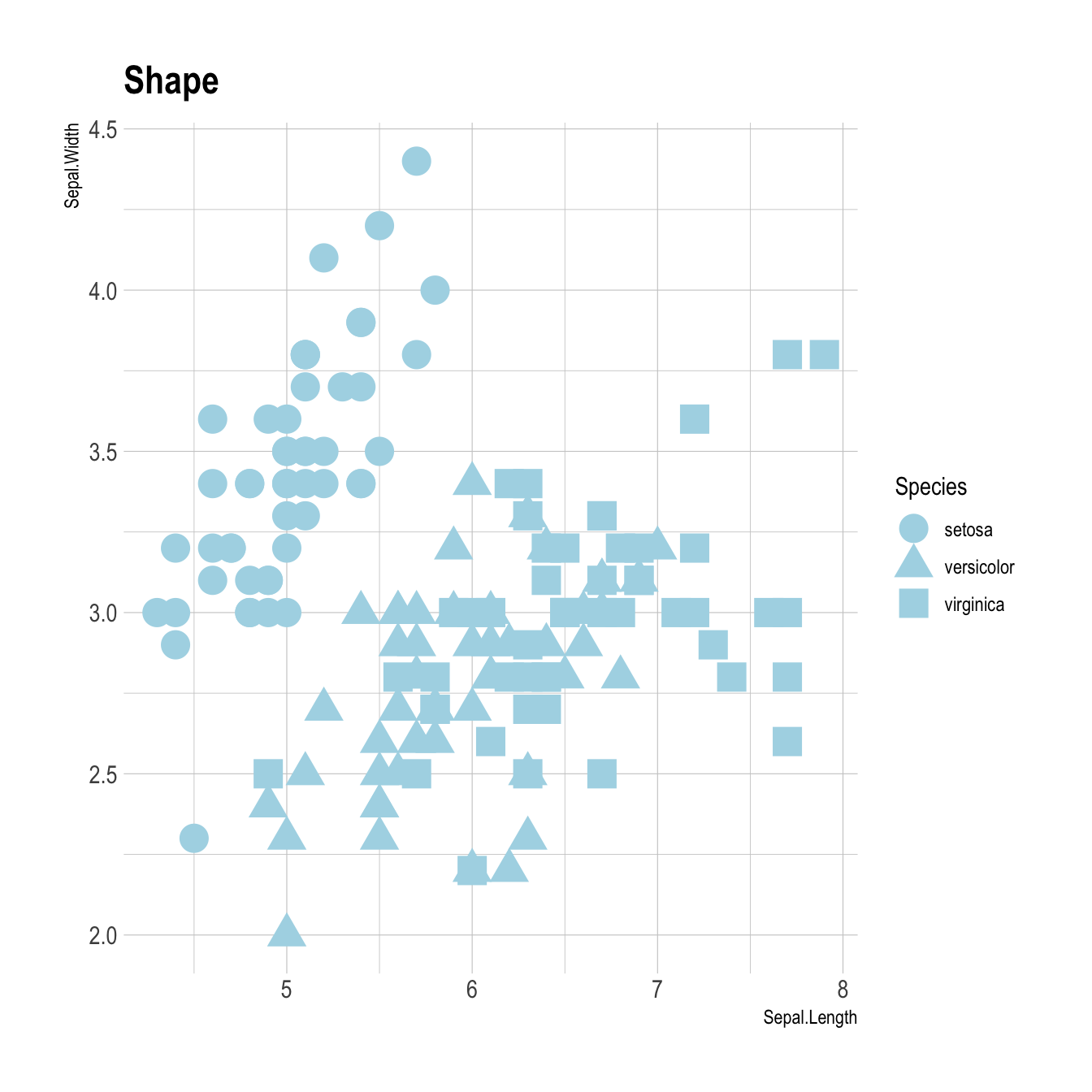 ggplot(iris, aes(x=Sepal.Length, y=Sepal.Width, shape=Species)) +