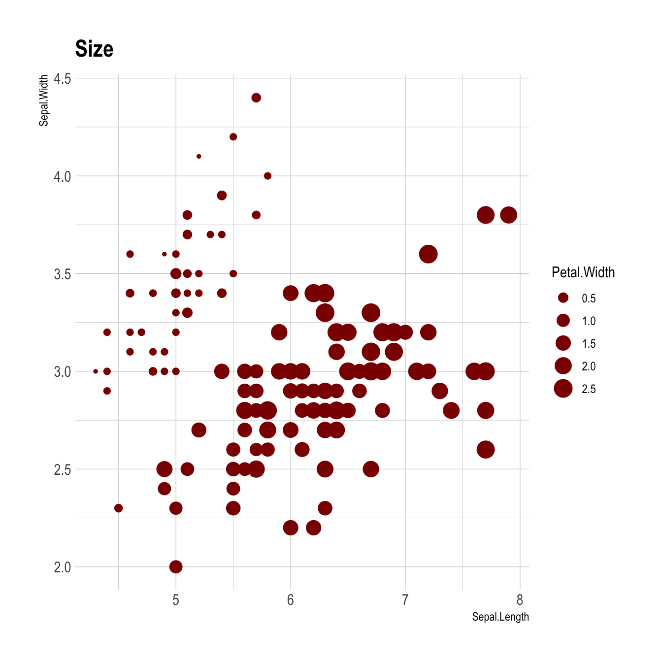 ggplot(iris, aes(x=Sepal.Length, y=Sepal.Width, size=Petal.Width)) +